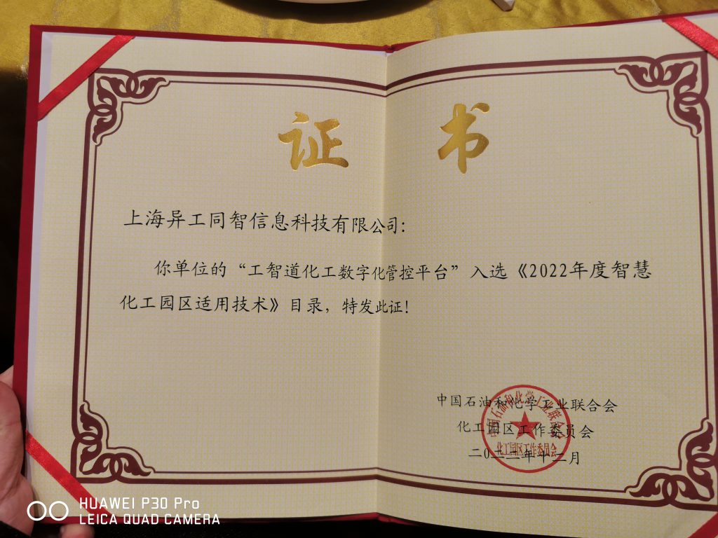 會(huì)上舉行了2022年(第二批)智慧化工園區(qū)適用技術(shù)目錄發(fā)布儀式。工智道化工數(shù)字化管控平臺(tái)入選。