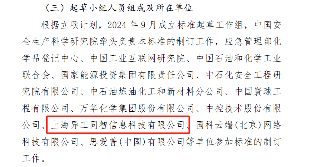 1 月 2 日,國(guó)家應(yīng)急管理部發(fā)布關(guān)于公開(kāi)征求《“工業(yè)互聯(lián)網(wǎng) + 危化安全生產(chǎn)” 建設(shè)標(biāo)準(zhǔn)》系列 3 項(xiàng)行業(yè)標(biāo)準(zhǔn)意見(jiàn)的函。上海異工同智(工智道)憑借其深厚的化工行業(yè)底蘊(yùn)、強(qiáng)大的自主研發(fā)能力、豐富的化工數(shù)字化成功案例以及國(guó)際化的視野和經(jīng)驗(yàn),應(yīng)邀參與此次行業(yè)標(biāo)準(zhǔn)起草工作。