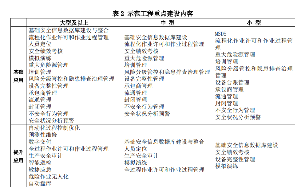 本次方案一大亮點(diǎn)就是,從框架和內(nèi)容上看,思路非常清晰,不僅對(duì)不同規(guī)模?;髽I(yè)有不同的要求,而且還區(qū)分基礎(chǔ)應(yīng)用和提升應(yīng)用,并沒(méi)有出現(xiàn)過(guò)去簡(jiǎn)單一刀切的做法。這點(diǎn)從方案最后一張“示范建設(shè)重點(diǎn)內(nèi)容表”體現(xiàn)的尤其突出: