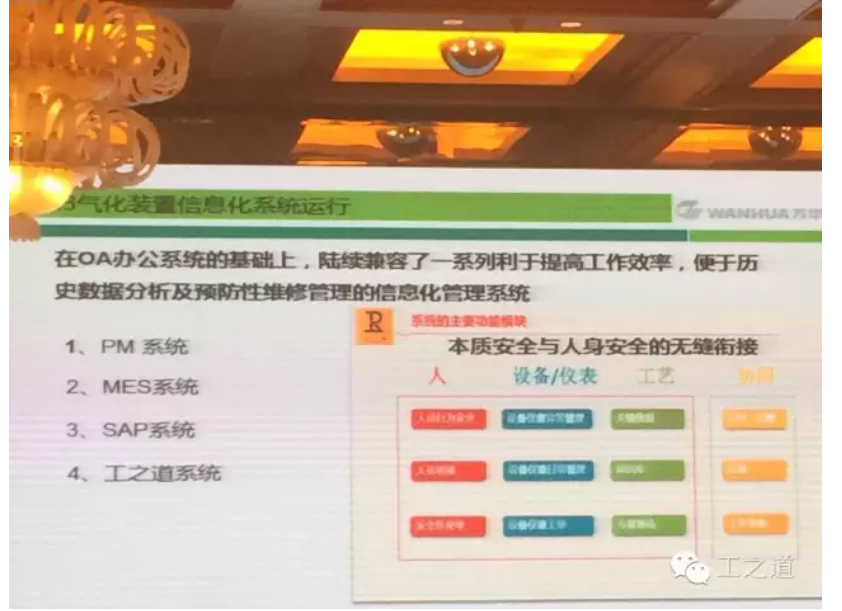 現(xiàn)有客戶萬(wàn)華集團(tuán)介紹了工之道系統(tǒng)與其他管理系統(tǒng)PM/MES/SAP協(xié)同使用情況,并介紹了工之道系統(tǒng)的優(yōu)點(diǎn)。