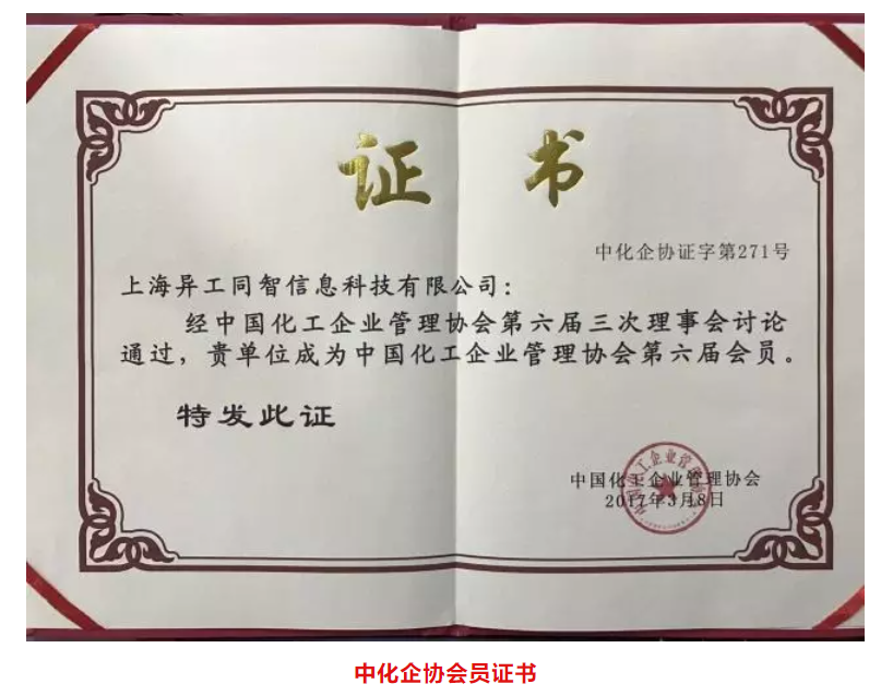 2017年3月8日,上海異工同智信息科技有限公司通過(guò)中國(guó)化工企業(yè)管理協(xié)會(huì)的嚴(yán)格審核,成為這一化工行業(yè)綜合性管理協(xié)會(huì)的新成員。