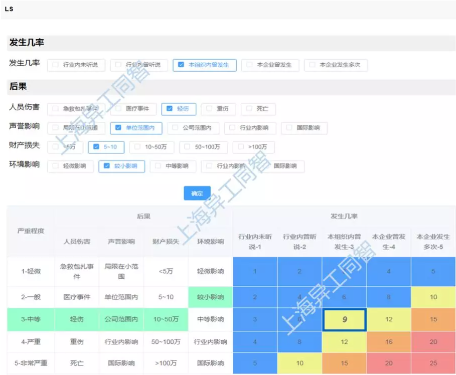 系統(tǒng)主要特點(diǎn)有: 植入企業(yè)的風(fēng)險(xiǎn)管理評(píng)價(jià)方法:記錄評(píng)價(jià)過程,保留評(píng)價(jià)結(jié)果,支持風(fēng)險(xiǎn)矩陣分析法(LS)和作業(yè)條件風(fēng)險(xiǎn)程度評(píng)價(jià)(LEC)兩種分析方法;評(píng)價(jià)結(jié)果會(huì)在安全風(fēng)險(xiǎn)地圖中實(shí)時(shí)顯示。